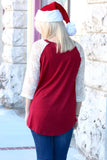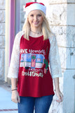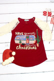 "Have yourself a merry little Christmas" lace sleeve raglan. Features an adorable Christmas trailer and cactus. 3/4 lace sleeves.